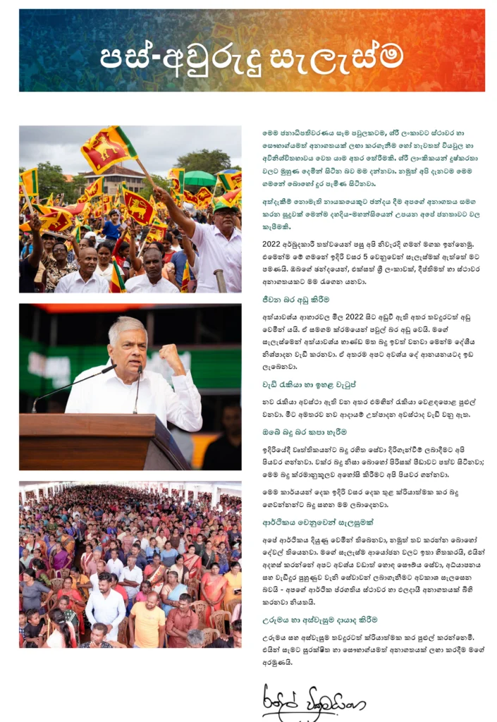 එළැඹෙන සැප්තැම්බර් මස 21 වැනිදා පැවැත්වීමට නියමිත ජනාධිපතිවරණයට ස්වාධීන අපේක්ෂකයෙකු ලෙස තරග කරන ජනාධිපති රනිල් වික්රමසිංහ මහතාගේ ප්රතිපත්ති ප්රකාශය අද දහවල් කොළඹ ටාජ් සමුද්රා හෝටලයේ දී එළි දක්වන ලදි.