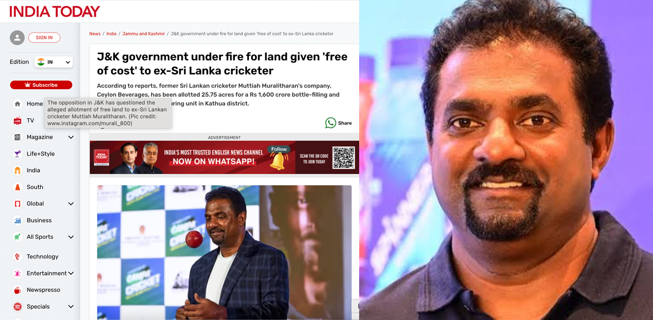 ශ්රී ලංකා ක්රිකට් ක්රීඩක මුත්තයියා මුරලිදරන්ගේ සමාගමක් වන සිලෝන් බෙවරේජස් වෙත අක්කර 25 ක නොමිලේ ඉඩම් වෙන් කිරීමක් සම්බන්ධයෙන් එල්ල වූ චෝදනාවලින් පසු ජම්මු සහ කාශ්මීර රජය සෙනසුරාදා මතභේදාත්මක තත්ත්වයකට මුහුණ දුන්නේය.
